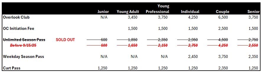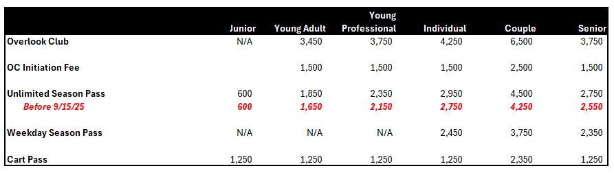 *Overlook Club membership must be committed to with down payment prior to October 1, 2025 to receive the $500 Overlook Tavern Credit. Overlook Tavern credit will be loaded to each Overlook Club member’s account in $100 installments each month from April through August and must be used in the month it was loaded. Overlook Tavern credit cannot be used for takeout, the beverage carts, or any area outside of the Overlook Tavern.